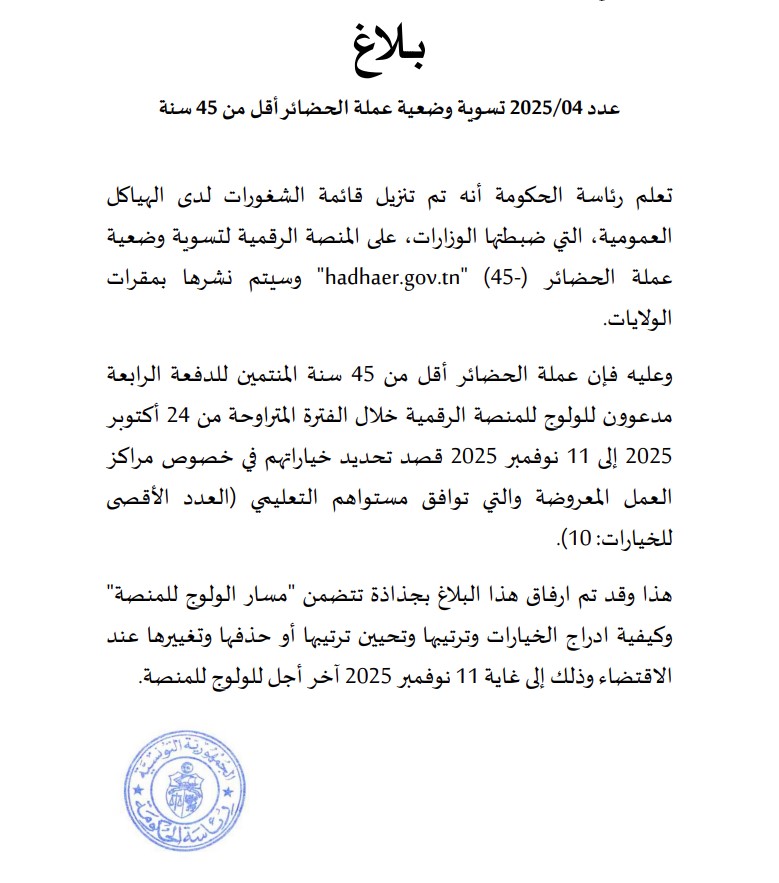 أفادت رئاسة الحكومة بأنه تم تنزيل قائمة الشغورات لدى الهياكل العمومية التي ضبطتها الوزارات على المنصة الرقمية لتسوية وضعية عملة الحضائر (45) hadhaer.gov.tn وسيتم نشرها بمقرات الولايات.