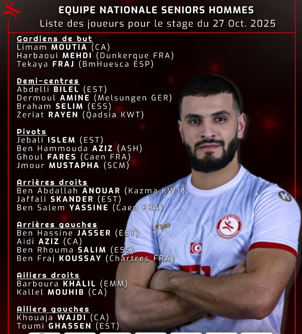 فيما يلي قائمة لاعبي المنتخب الوطني للأكابر المدعوين للمشاركة في التربص التحضيري بقرنبالية من 27 أكتوبر إلى 1 نوفمبر والذي تتخلله المشاركة في دورة المرحوم الهاشمي رزق الله الدولية الودية التي تنظمها الجامعة التونسية لكرة اليد بمشاركة منتخبات الكويت، إيران وغينيا من 29 أكتوبر إلى 1 نوفمبر في إطار استعدادات عناصرنا الوطنية للمشاركة في كأس إفريقيا للأمم القادمة التي ستدور برواندا في شهر جانفي 2026.